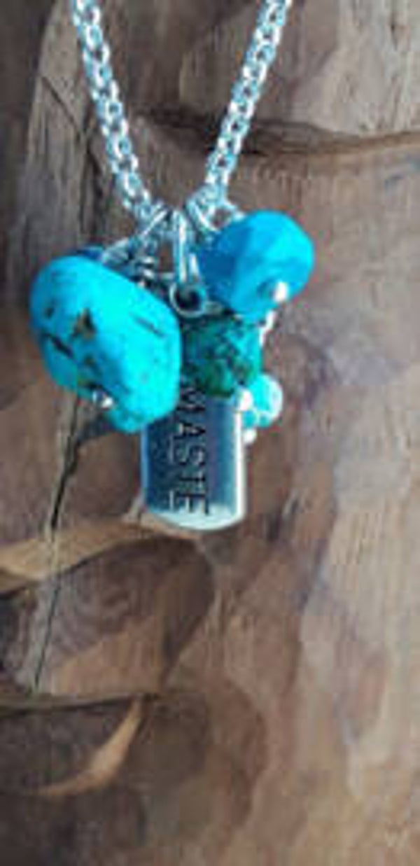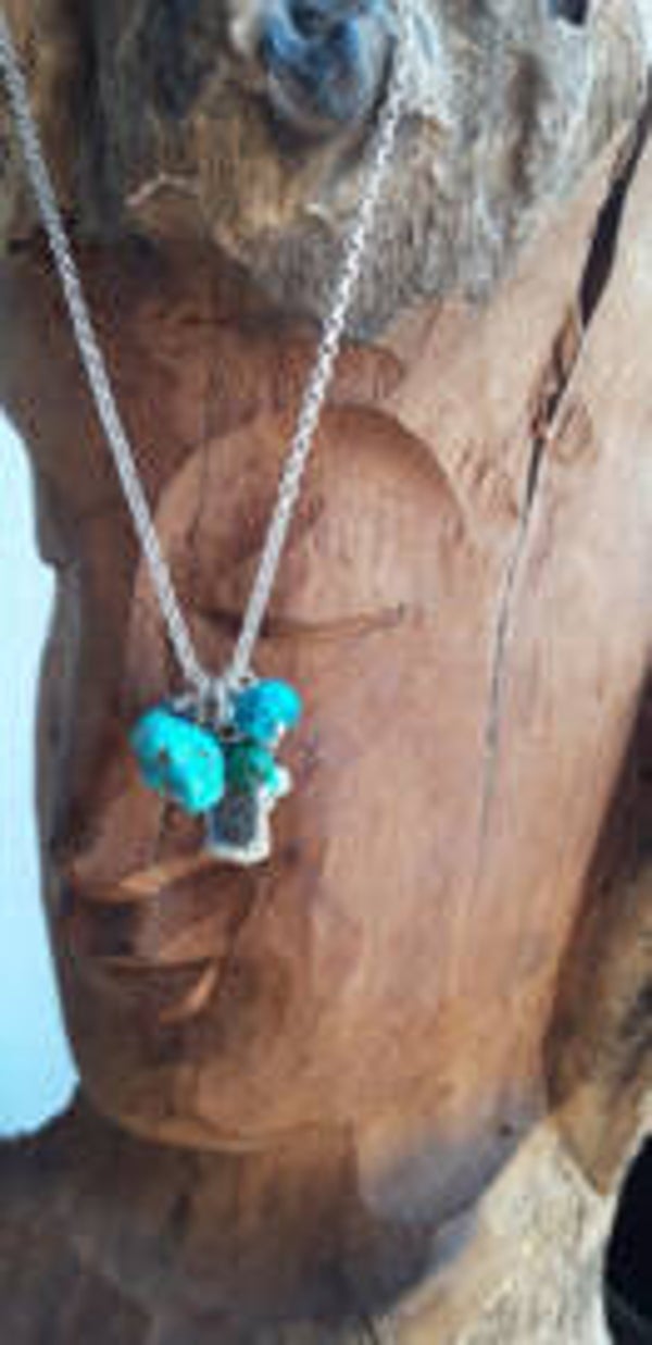 50cm zilveren ketting met verschillende turkoois kralen ( Arizona, Turks) en labeltje
