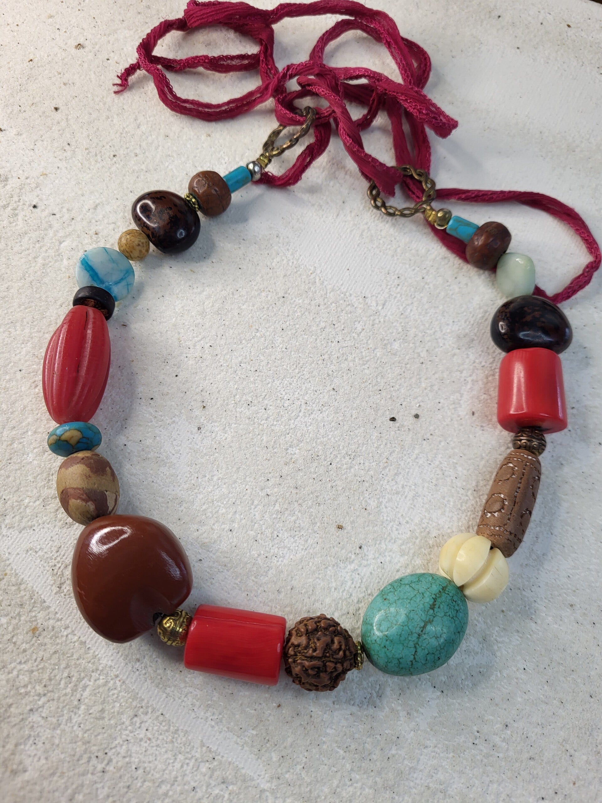 Deze ketting heeft prachtige kleuren en bijzondere kralen: Turkoois=howliet,Jaspis, kokos, been, oude keramiekkralen, oude kleikralen uit Indonesie, koper op bronskralen van een oude gebedsketting uit Ethiopie, cinnebarkraal, lumbanpit en bamboekoraal.Met handgeverfde zwarte zijden lint ( kan ook met leder of zijde)