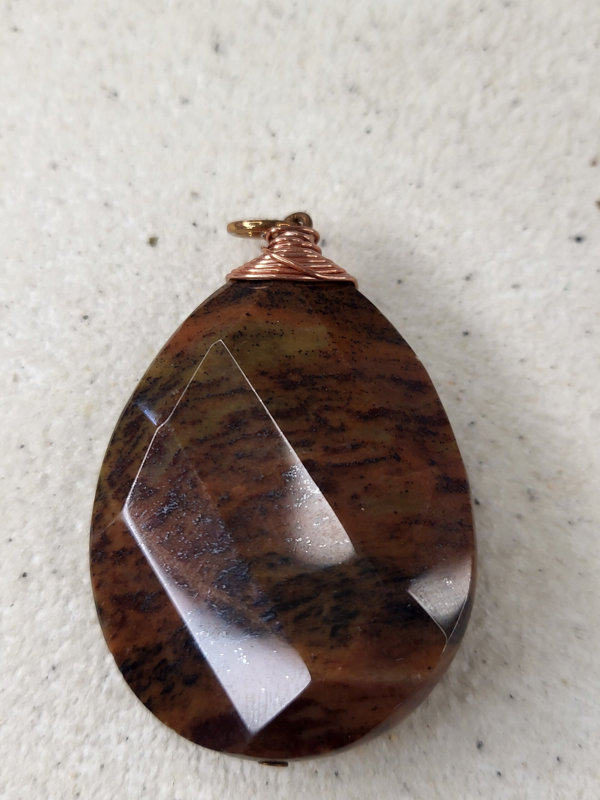 prachtige 50x30mm facet geslepen jaspis met koperdraad omwikkeld excl een gevlochten lederen ketting.