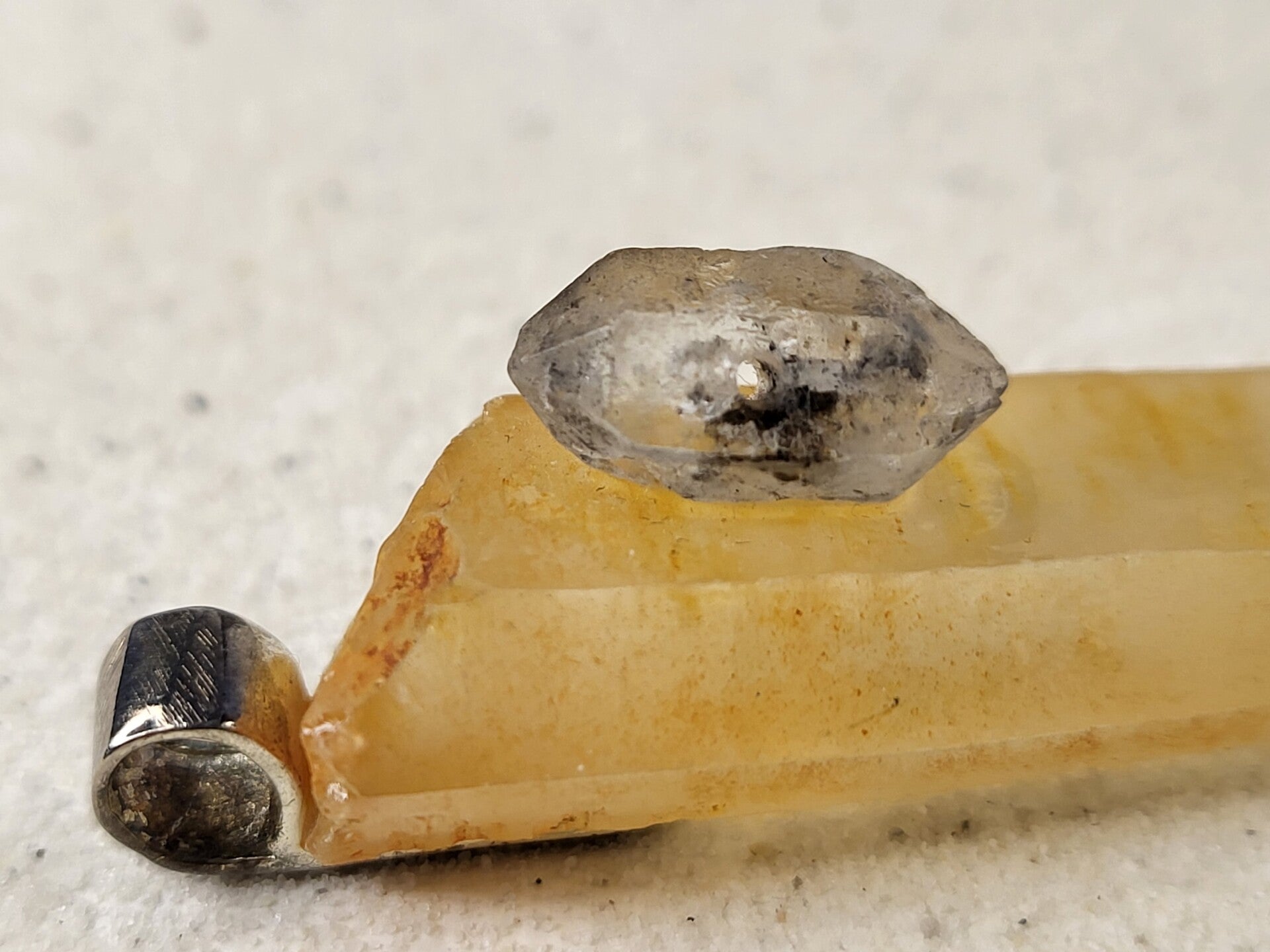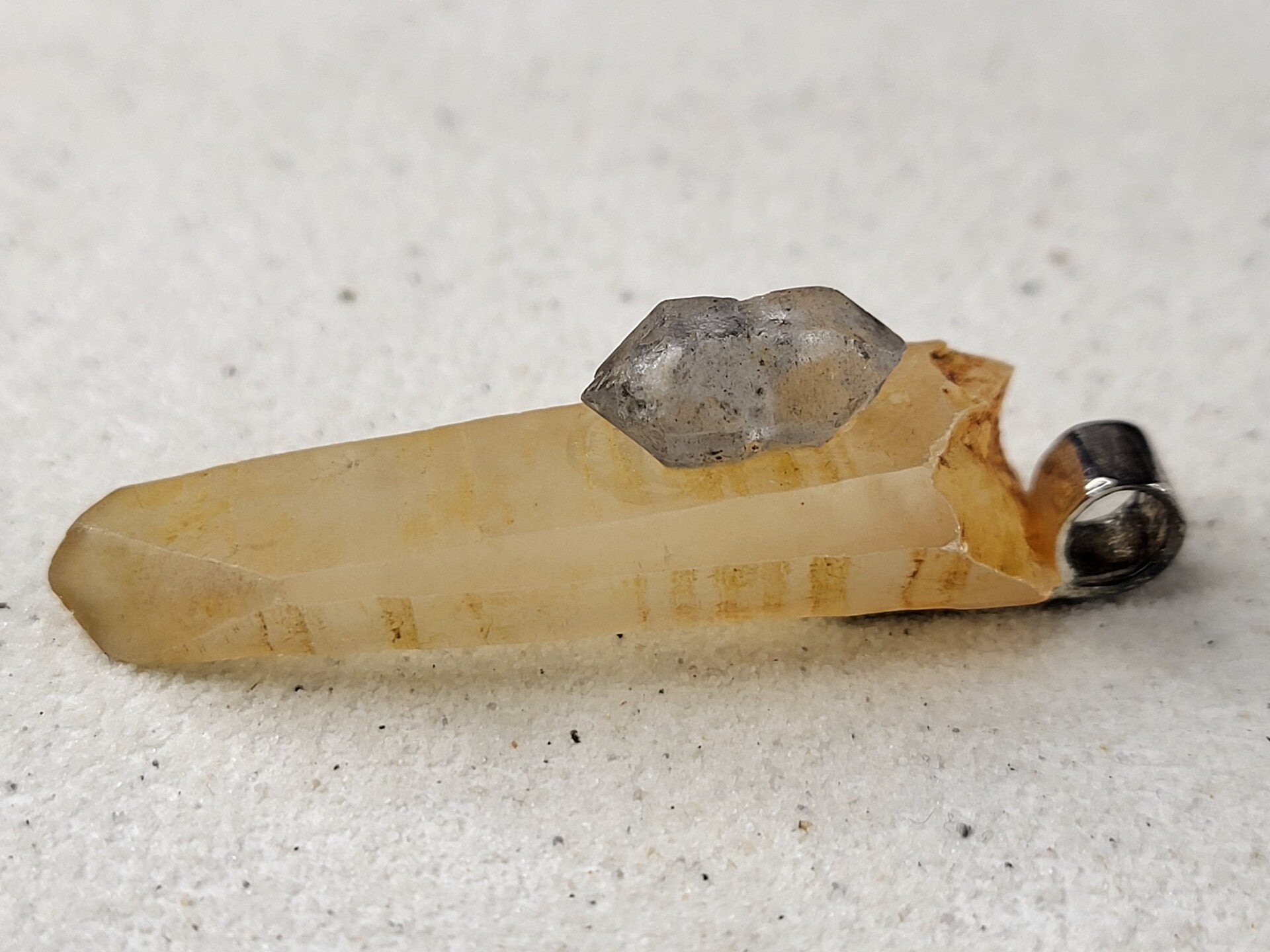 Deze 654mm lange hanger van tangerine kwarts heeft een extra herkimer diamantjes