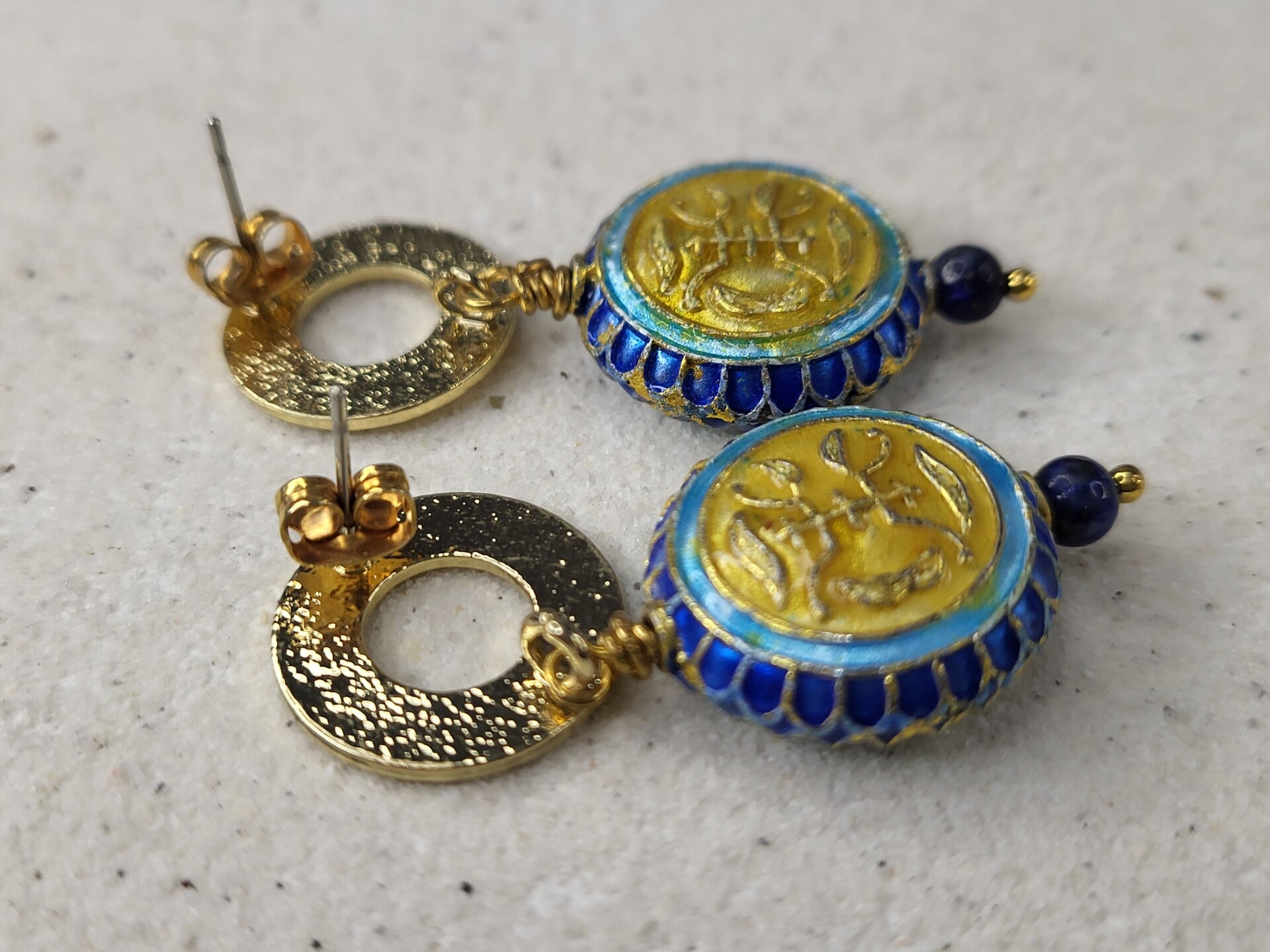 Gouden oorstekers met metalen holle muntjes en lapis lazuli , totale lengte vanaf steker 40mm