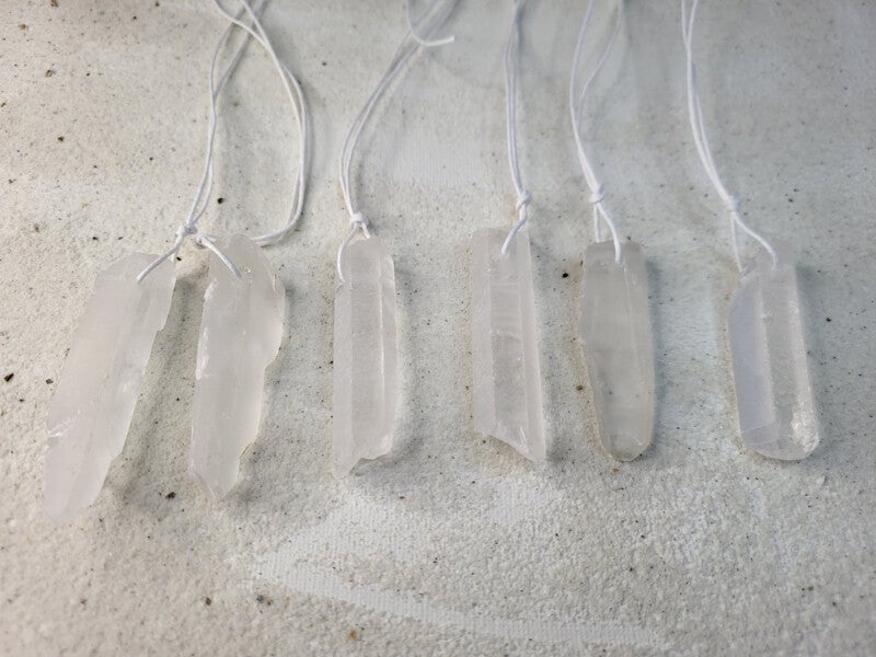 Ruwe bergkristal punten aan een wit waxkoord van links naar recht 1,2,3,4,5,6