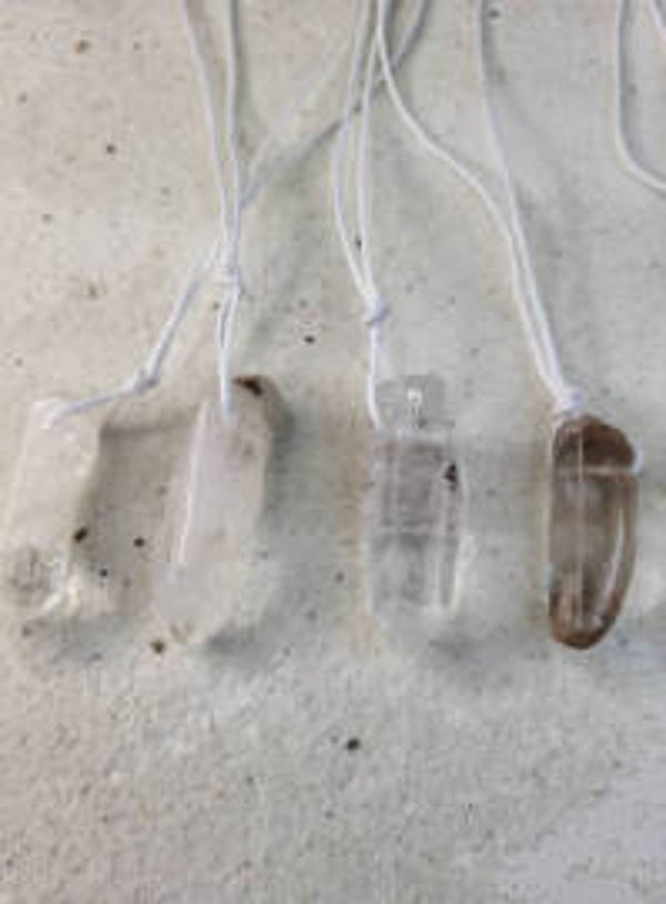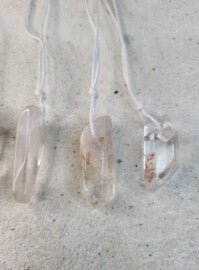 Mooie getrommelde kristal punten met insluitingen aan wit waxkoord. De 1 heeft meer insluitingen dan de ander. Van links naar rechts 21,22,23,24,25,26,27