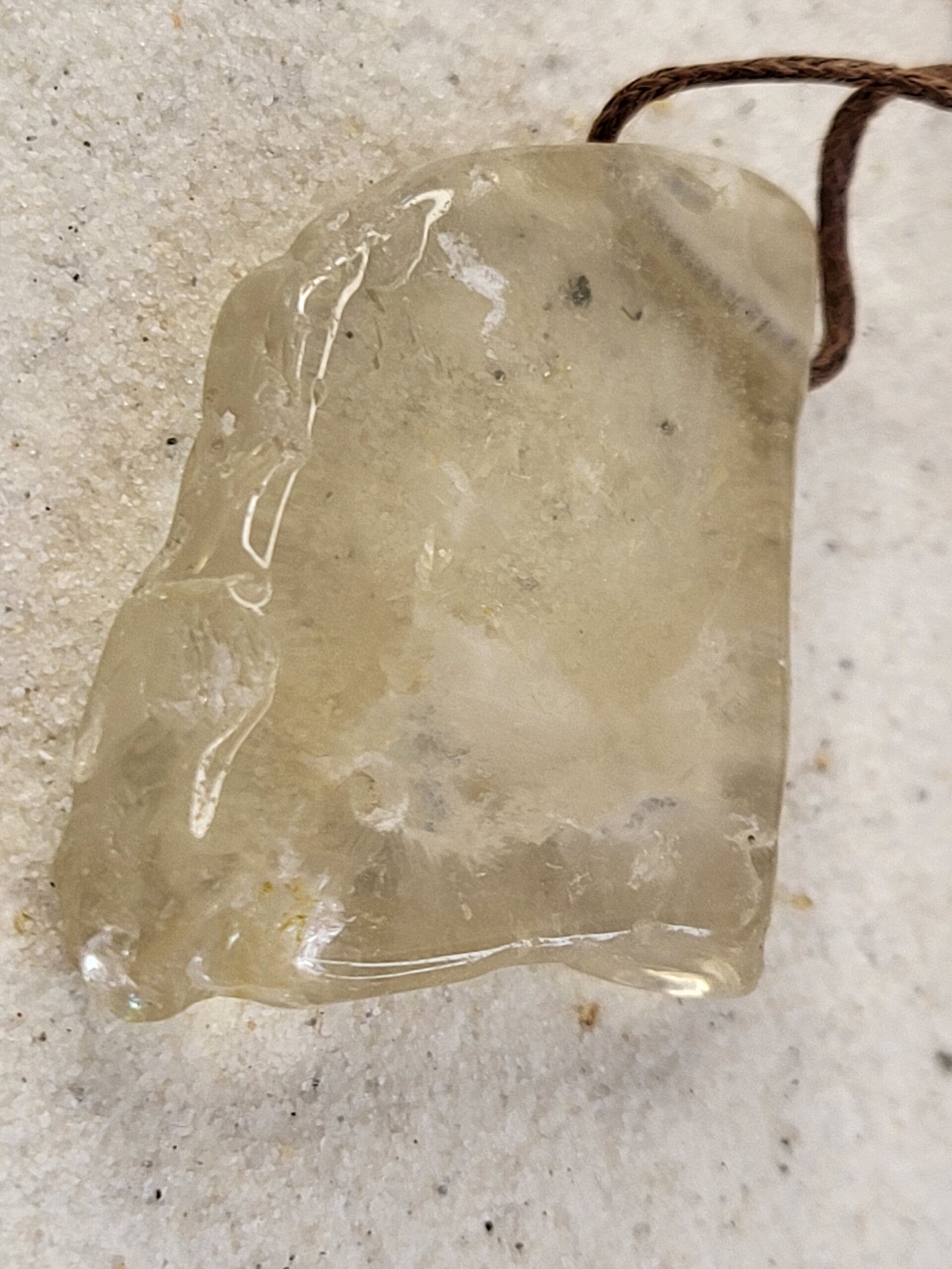Gepolijsd bergkristal 40x30mm aan bruin waxkoord