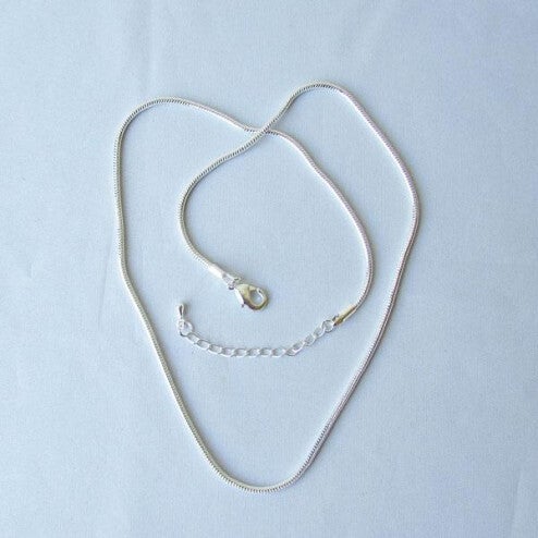 Zilverkleurige Snake ketting met een lengte van 45 cm. Deze ketting valt heel mooi om de hals en heeft een dikte van 2 mm, afgewerkt met een lobsterslot en een verlengketting van 5 cm.