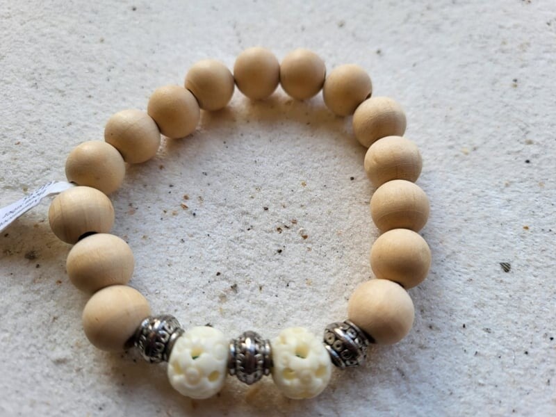 Armband hout met bewerkte fossiel mammoetbeen uit de permafrostlaag te Siberië maat 18/19.