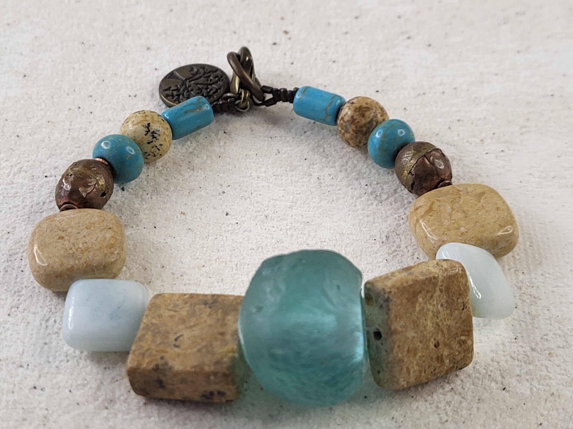 Armband met brozne lsuiting met een grote oceaan blauwe glaskraal, handgemaakt uit Ghana. Vierkante fossiel zandkralen. oude koperen kralen uit een gebedsketting uit Ethiopië. Jaspis en Turkse turkoois. Maat 17