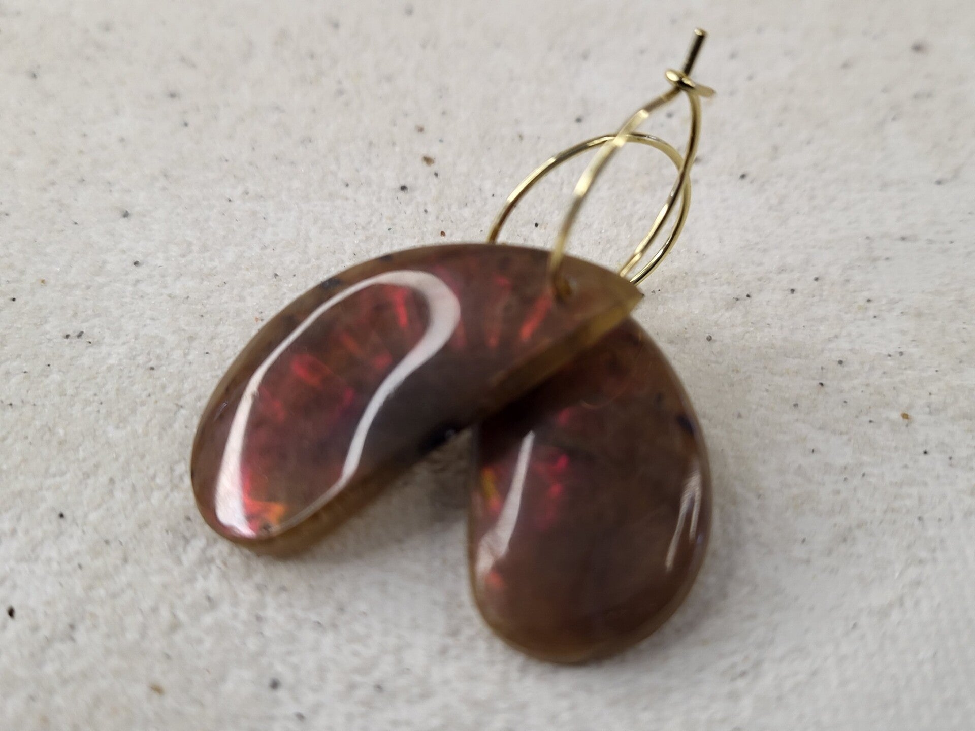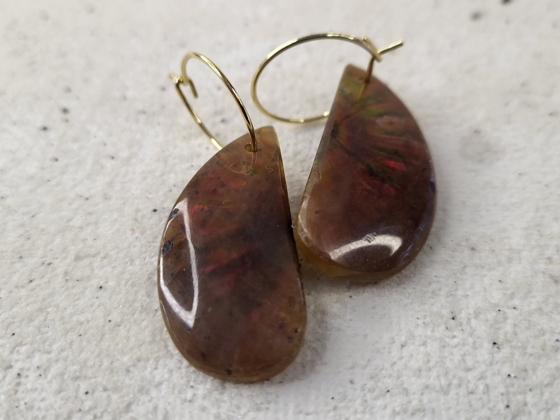 Prachtige en unieke rood iriserende ammonieten aan gold plated edelstaal creooltjes ( wil je haakjes of stekers vraag wat mogelijk is) zie je de prachtige gekleurde glans. totale lengte 40mm. Creolen zijn 15 mm, echt uniek