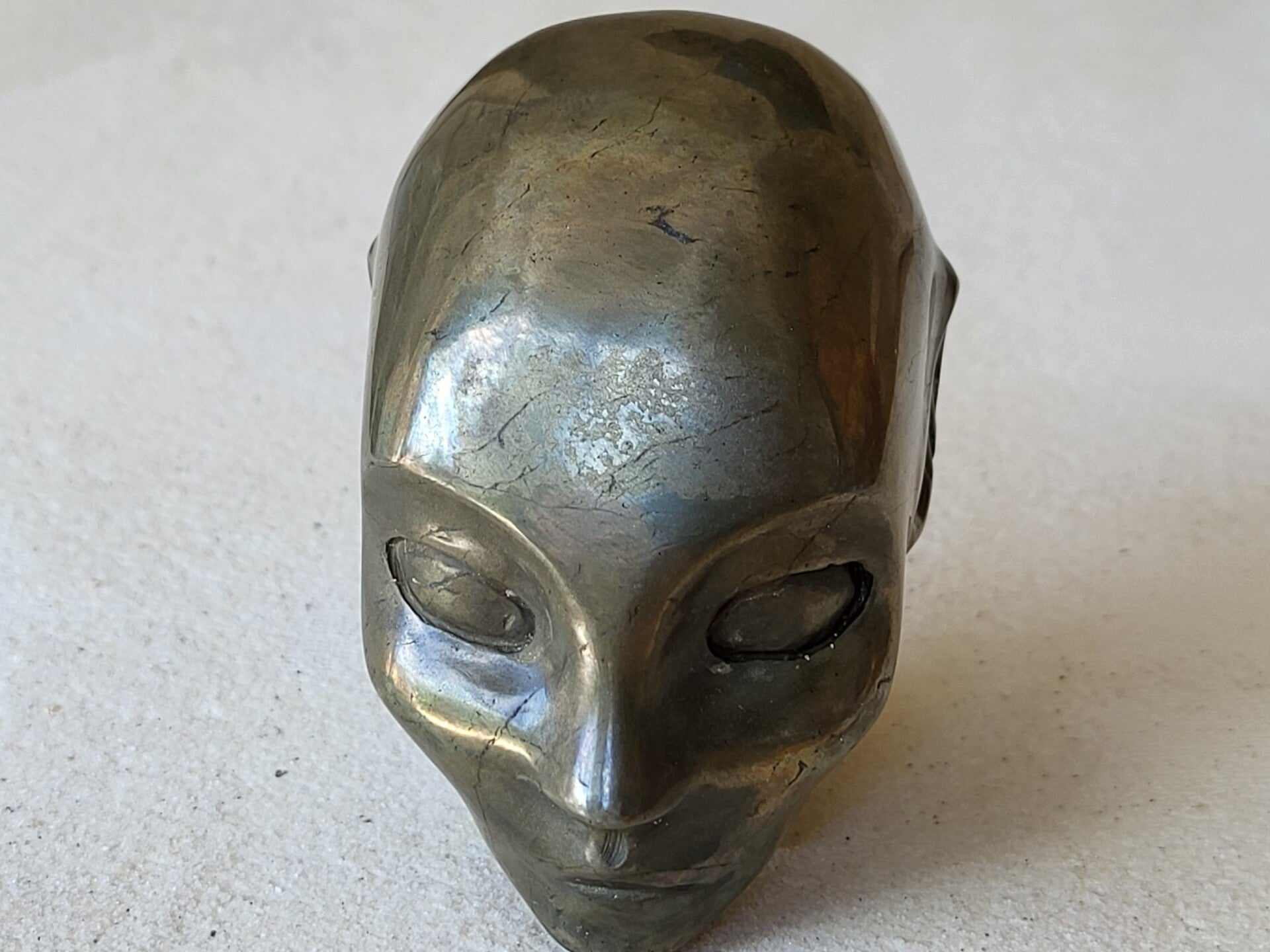 Prachtige handgeslepen pyriet Elven One: 75x43x75mm met mooie streep van witte calciet