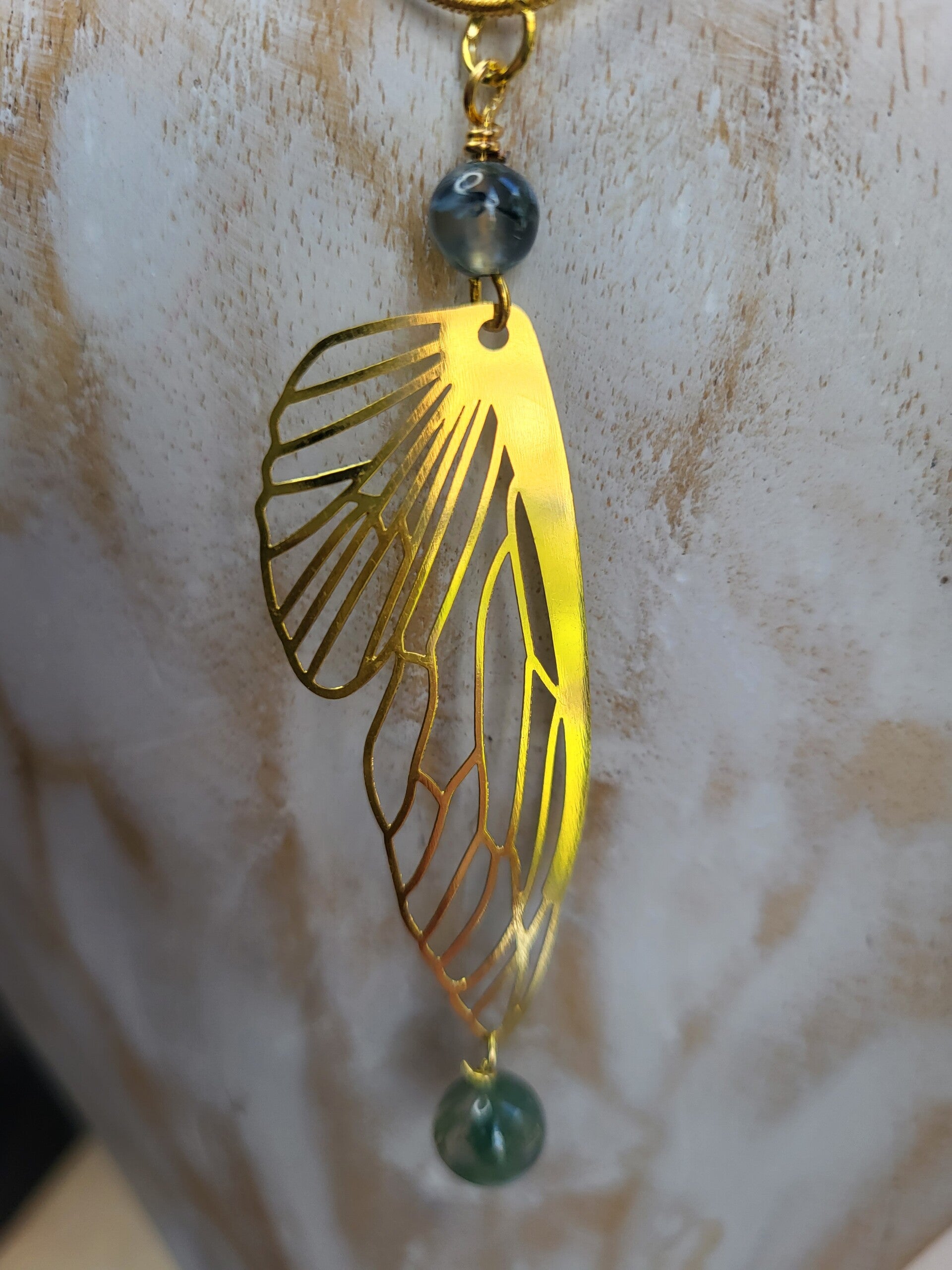 Gouden elvenveleugel met mosagaat , totale lengte 80mm kleine kraal boven en onderaan grotere