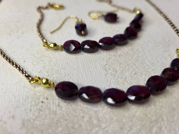 Een mooi setje van kleine facet geslepen granaat kralen : armband , ketting en oorhangers. Goudkleurig. armband lengte....mm, ketting lengte mm, oorbellen lengte mm