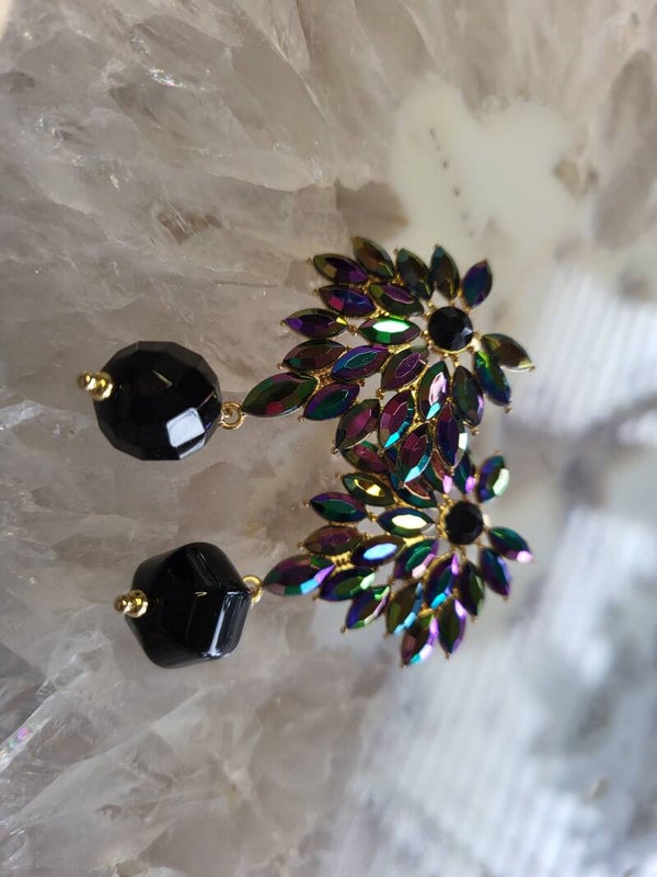 Geweldige statement oorbellen goudkleurig met strasssteentjes in regenboogkleuren en facet geslepen onyx. Totale lengte vanaf oorstekers is 55mm