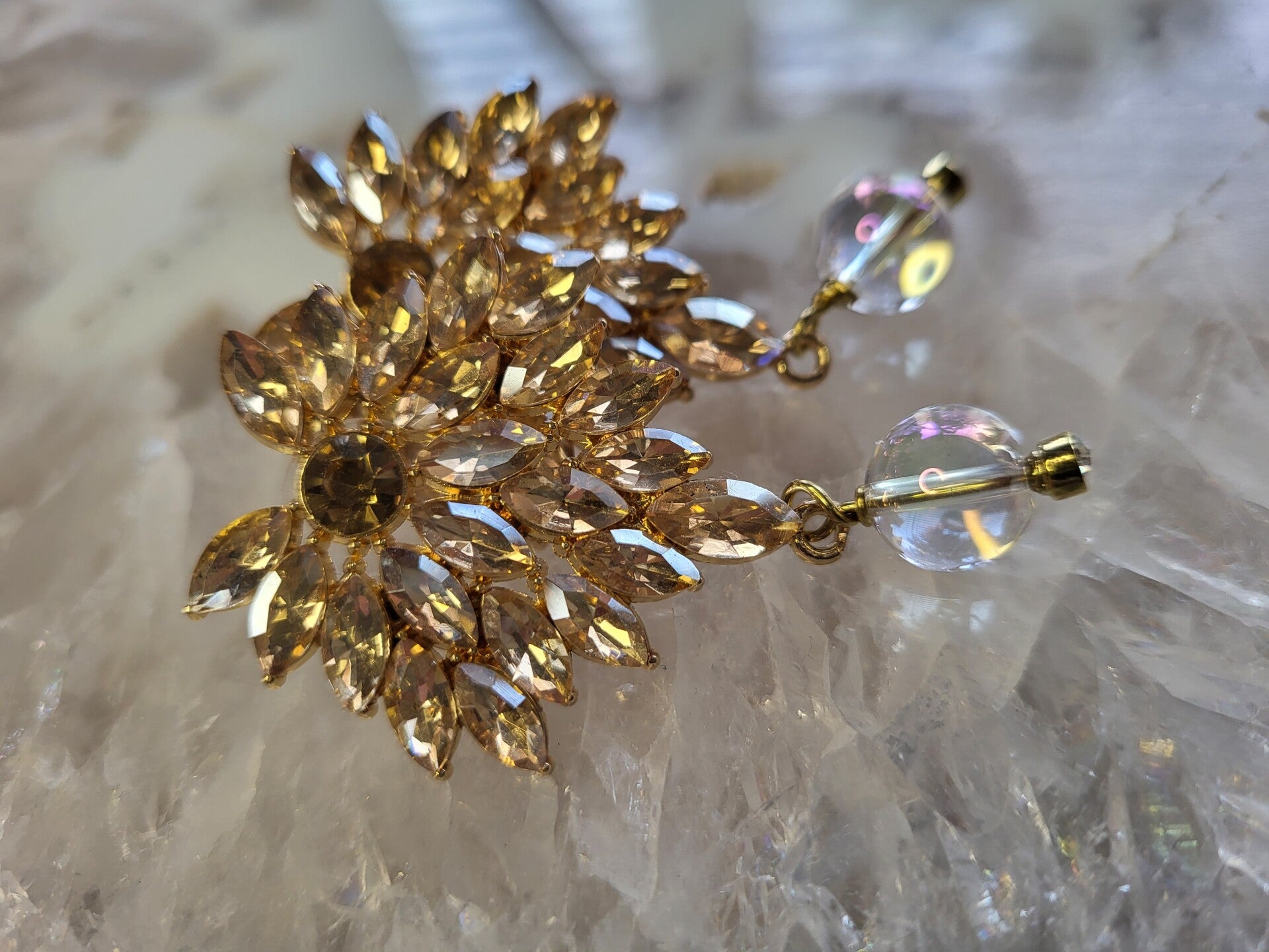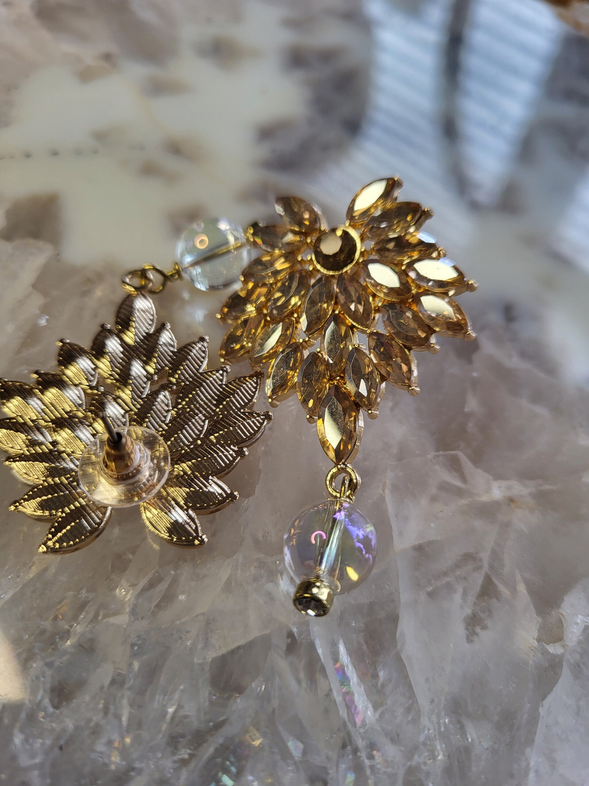 Geweldige statement oorbellen goudkleurig met strasssteentjes en angel aura kwarts. Totale lengte vanaf oorstekers is 50m