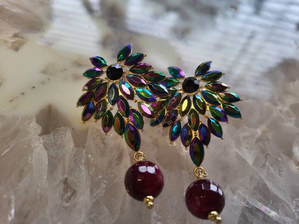 Geweldige statement oorbellen goudkleurig met strasssteentjes in regenboogkleuren en facet agaat (bijgekleurd). Totale lengte vanaf oorstekers is 52mm