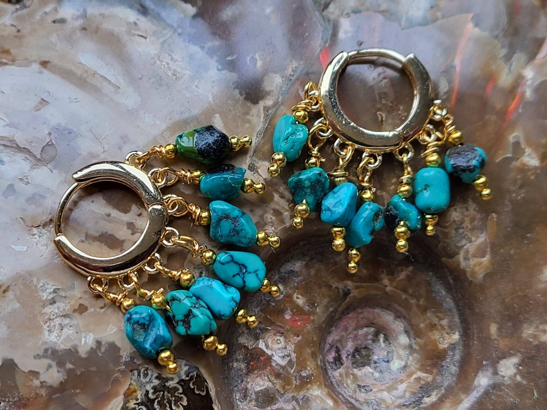 Mooie 15mm gouden klapcreooltjes met freevorm Arizona turkoois, lengte totaal mm